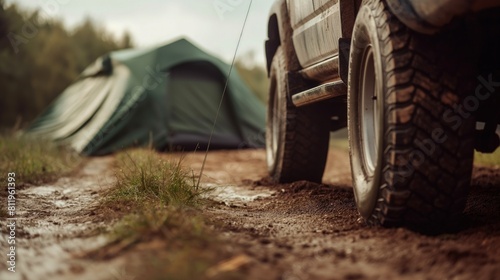 Ciężarówka została zaparkowana na bocznej drodze o ziemiastym podłożu, obok znajduje się namiot. Sceneria wskazuje na kemping lub podróżowanie
