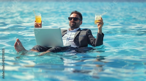 Summer vacations and freedom travel concept Portrait of funny business man on the beach Businessman in suit floating with laptop and cocktail in pool Crazy business man dreams on summe : Generative AI