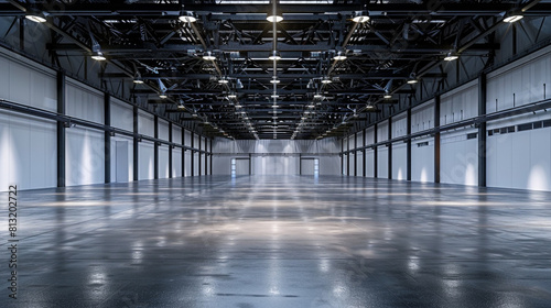 Spacious empty exhibition shed with high ceilings and spotlights, prepared for an event that never took place.