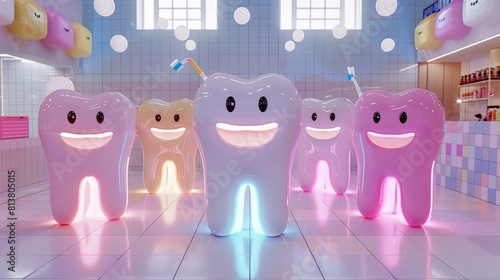 group children happily brush their teeth, Vibrant 3D illustration five tooth characters in various shades standing in brightly lit bathroom, each exhibiting demeanor, Environment reflects clean.
