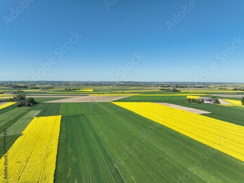 #435403169Aerial View of Vibrant Green and Yellow Agricultural Fields Under a Clear Blue Sky