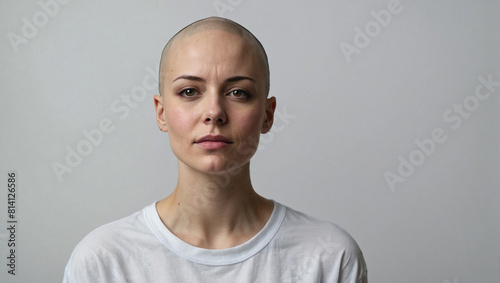 Frontal view of a bald young woman in a white shirt