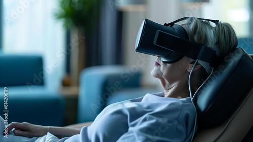 A patient wearing a VR headset in a therapy session, where AI algorithms help treat psychological conditions
