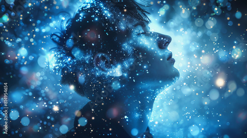 A person's profile blended with a cosmic starry background, giving a surreal, celestial feel, symbolizing imagination, dreams, or connection with the universe.