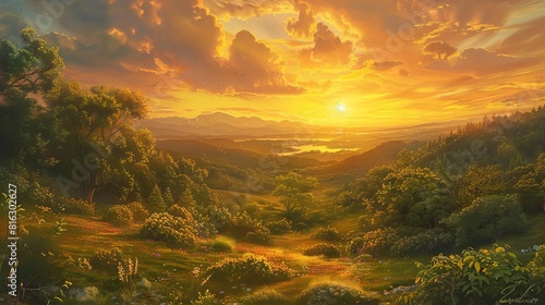 A serene landscape painting, executed in the classical realism tradition, depicting a golden sunset over a lush, verdant valley, Close up