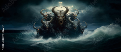 Revelation's Apocalyptic Beast: Depiction of the Seven-Headed, Ten-Horned Monster from the Book of Revelation, Signifying Eschatological Events and End-Time Prophecy, Biblical Conceptual Artwork.