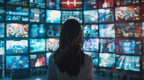 Woman surrounded by multiple TV screens