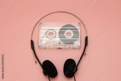 A pair of 1990's style headphones and and cassette tape on a pink background retro vintage music concept image