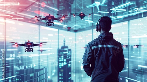 Mężczyzna stoi przed pomieszczeniem, w którym unosi się wiele różnych obiektów. Wygląda na to, że obiekty lecą wokół niego lub są w stanie unosić się w powietrzu