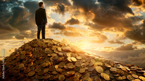 Man standing on pile of golden coins, on top of a mountain, dreams of being rich