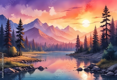 Piękny krajobraz zachodzącego słońca nad rzeką z widokiem na góry i zachodzące słońce. ilustracja jako obraz na ścianę lub okładka książki oraz do innych projektów. Cudowny efekt farb wodnych