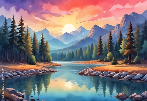 Piękny krajobraz zachodzącego słońca nad rzeką z widokiem na góry i zachodzące słońce. ilustracja jako obraz na ścianę lub okładka książki oraz do innych projektów. Cudowny efekt farb wodnych
