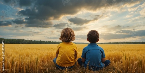 Two small children, a boy and a girl, sitting on the grass, symbolizing childhood and friendship.