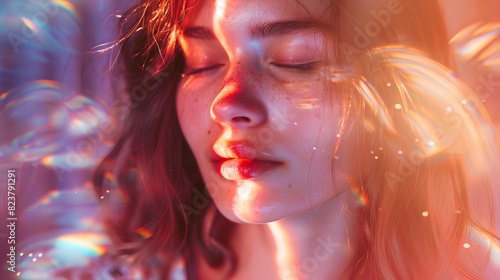 Young woman with closed eyes in dreamy, ethereal light. Soft colors and gentle hues evoke a sense of calm and introspection.