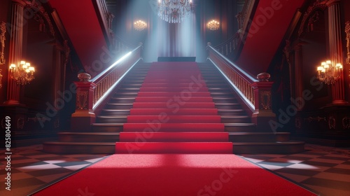 Red carpet with spotlight and flash. Red carpet and ceremonial VIP staircase, close up. VIP luxury entrance with red carpet. interior of the palace. digital ai
