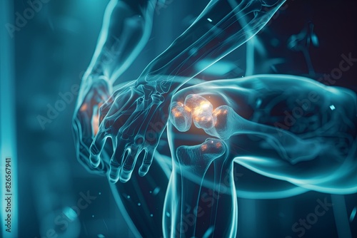 Joint and knee pain, augmented reality animation. Close-up of a man experiencing discomfort as a result of arthritis. 3D rendering