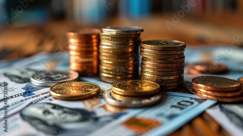 coins on table with stock graph background