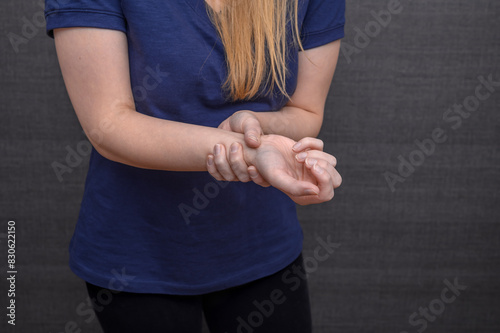 Ból i drętwienie ręki, kobieta trzyma się za swój nadgarstek