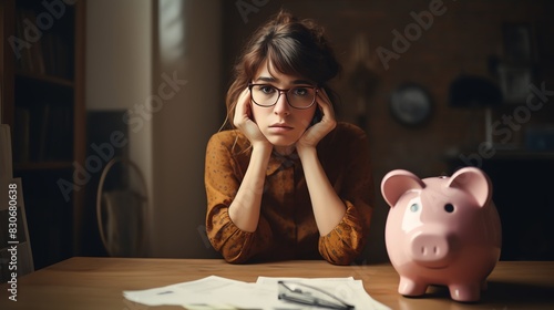 Pensive woman with glasses sits at a table with a pink piggy bank, papers, and pen, reflecting on financial matters in a cozy indoor setting.