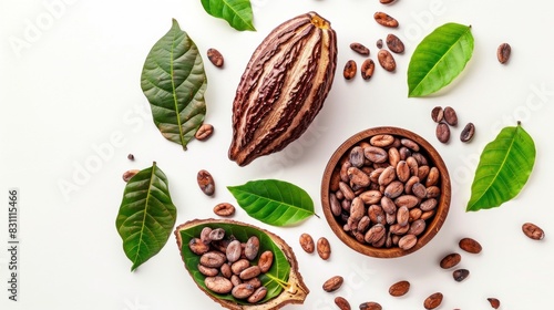 Cacao beans and bodhi leaves capital isolated on white background