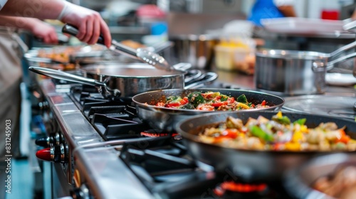 Professional kitchen with multiple pots and pans on the stovetop, busy with various dishes being cooked, highlighting the hustle and bustle of restaurant cooking