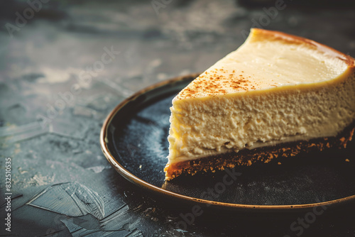 Slice of New York Cheesecake on Plate, Resting on Concrete Floor