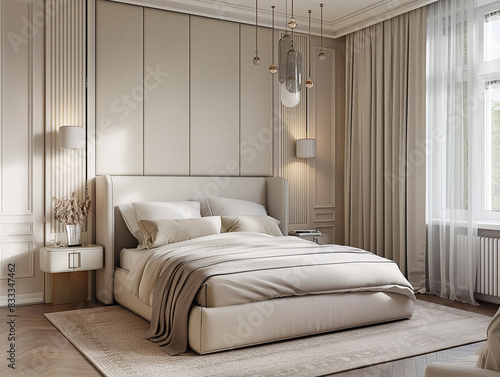 Jasna, słoneczna, elegancka sypialnia w klasycznym stylu - podwójne łóżko, lampki nocne.