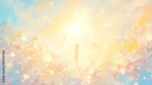 神秘的な光に照らされる少女のシルエットの水彩イラスト背景