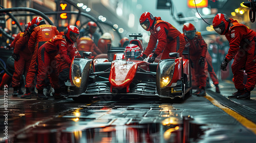 Professional pit crew ready for action as their team's race car arrives in the pit lane during a pitstop of a car race, concept of ultimate teamwork