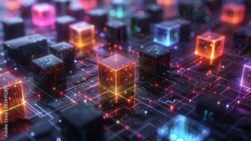 Isometric modern illustration of Big Data, AI, and cloud solutions for online schools, classes, and courses. Abstract datacenter or blockchain network background.