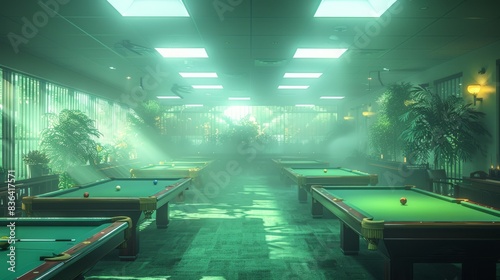 The interior of a stylish club features billiard tables with green cloths