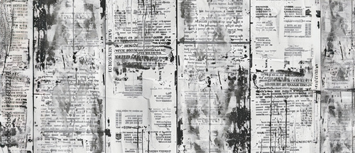 Fondo de textura de periódico con tipografía vintage y elementos angustiados. Patrón de periódico, collage de periódico, estilo grunge, sucio, negro sobre blanco, alta resolución, alto detalle