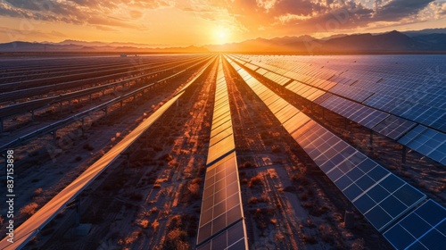 A vast solar farm in the desert, with rows of solar panels capturing the sun's energy, highlighting sustainability and technological advancement.