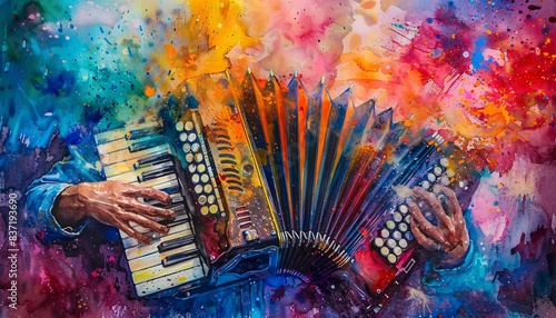 Vibrant Abstract Painting of Hands Playing Accordion with Colorful Background, Expressive Art, Musical Instrument, Creative Expression, Dynamic Brushstrokes, Artistic Inspiration, Music and Art Fusion