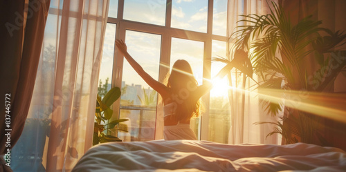 A woman is in bed, smiling and stretching her arms after waking up at sunrise early morning.
