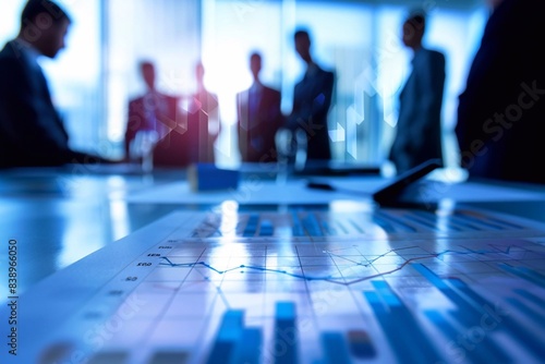 Business professionals in a strategic vector illustration meeting with a blurred stock graph chart highlighting benchmarking data