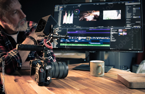 Photographe videaste devant un ordinateur en train de faire du montage et de la post-production dans un studio