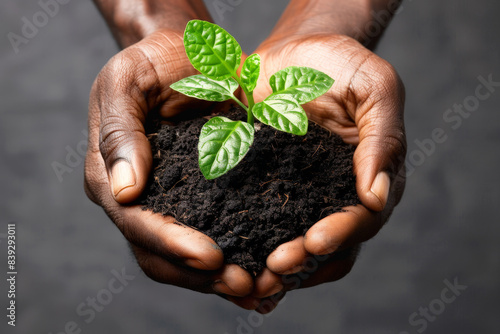 An inspiring image focusing on a pair of black hands nurturing a young green plant in a clump of rich soil