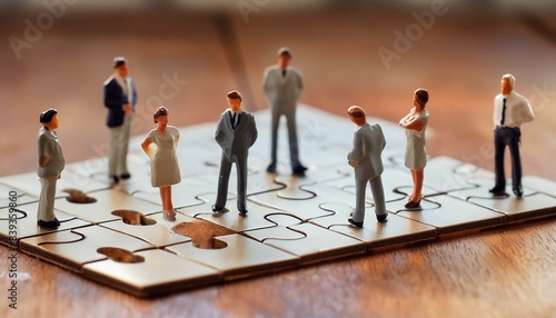 grupo de personas empleadas que permanecen quietas en el tablero del rompecabezas sin terminar tratando de trabajar juntas para encontrar la solución al problema del que hablan entre sí