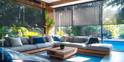 Contemporary blackout roller blinds complemented by high-tech plant pots and motorized curtains. Concept Modern Home Decor, High-Tech Innovations, Smart Living Solutions, Stylish Window Treatments