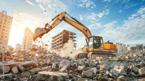 An excavator demolishes a building in an urban area, with rubble, dust, and sunlight creating a dramatic scene of construction activity.