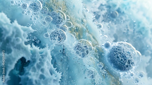 Photorealistic close-up of a liquid nitrogen bank containing suspended cells, intricate frost patterns, cold vapors