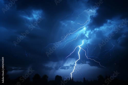 A powerful bolt of lightning illuminates the dark sky during a nighttime thunderstorm
