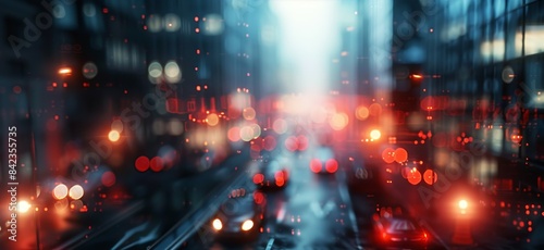 Blurred view of traffic lights in the rain.