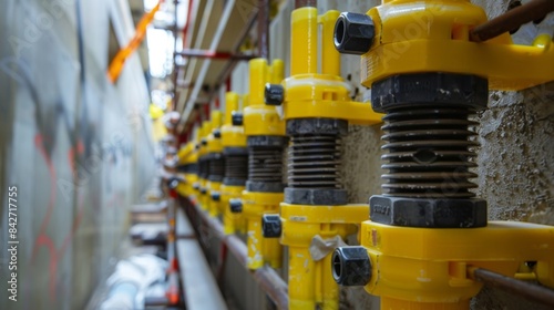 A closeup shot captures the installation of specialized shock absorbers designed to absorb the impact of an earthquake and prevent damage to the buildings structure.