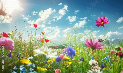 Vibrant Wildflowers Bloom in Spring Meadow Landscape of Flower Field Under Sunny Sky