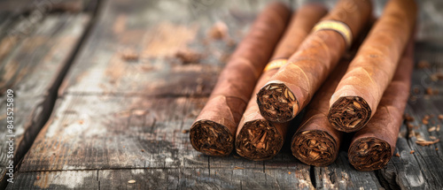 A collection of cigars with dark, rich hues lies in a rustic display on a worn wooden table, accentuating their textured surfaces and artisanal craftsmanship.