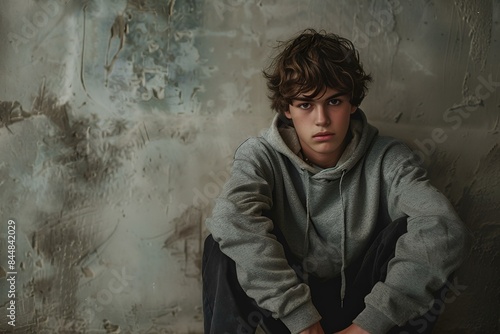 Młody mężczyzna w szarej bluzie – melancholijny portret