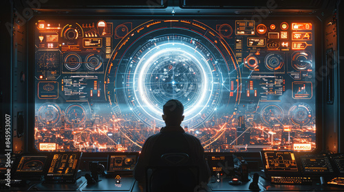 A futuristic office with holographic screens, advanced gadgets, and a team of professionals working on innovative projects