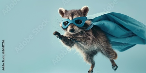 Cute superhero racoon, adorable funny raccoon with a blue cloak and mask jumping and flying on light blue background with copy space. The concept of a superhero raccoon, leader, funny animal studio.